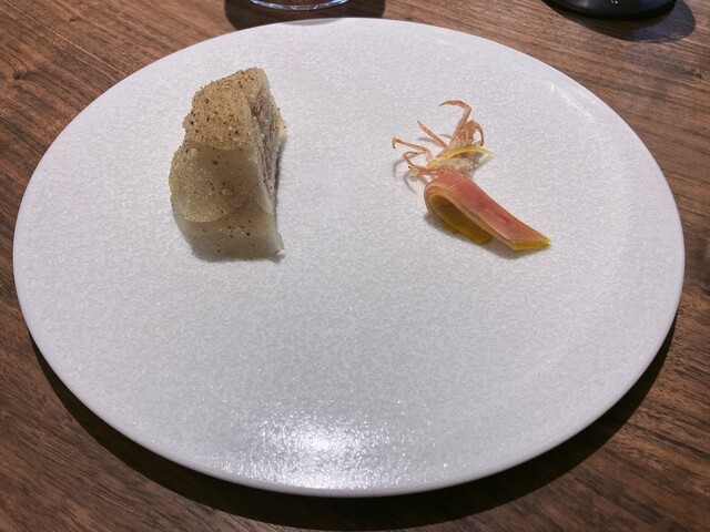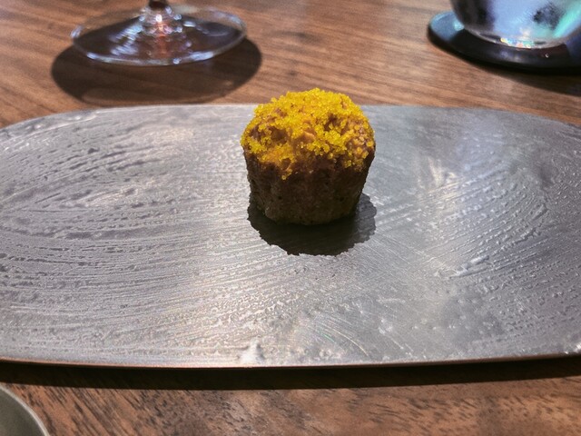 写真奥の山吹色のパウダーがかかったアミューズ。