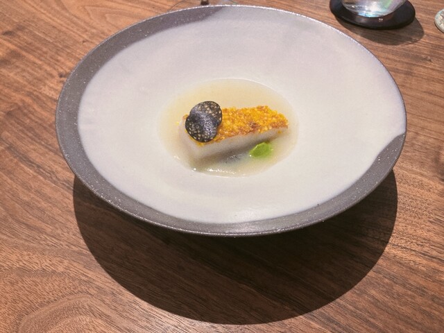 ★9.5 MINGLING POT: 三種の餃子(魚、韓牛、モレル)、牛の膝軟骨、干しなまこ、あわび、どんぐり、コールドブリューいりこダシ(←アンチョビだと思う)