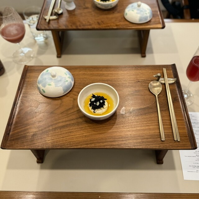 江南区の高級店エリア飲食店ビル4階、伝統的な韓料理に現代的なアレンジを加えた2つ星レストラン。ペアリングはワイン・酒2択で酒チョイス、7種出てきます。キムチのワゴンサービスには驚き、全部食べたいですが...