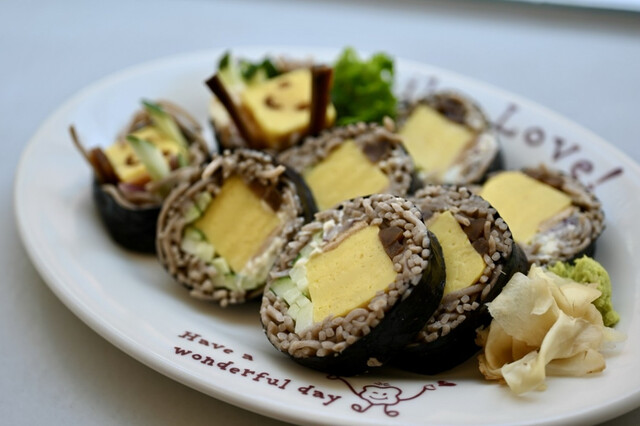 ラバーダックオムライスは写真で見るより数倍可愛くて思わず叫んでしまったほど!とろとろオムライスに、やっぱりね、ソースが美味しいのです。気になっていた蕎麦巻きキンパもヘルシー。そしてどれも絶品。