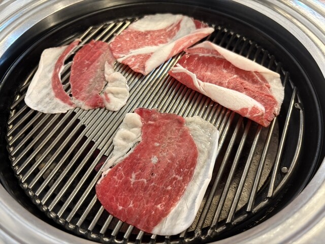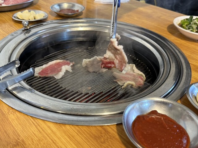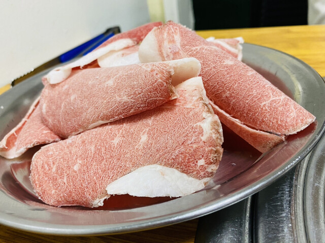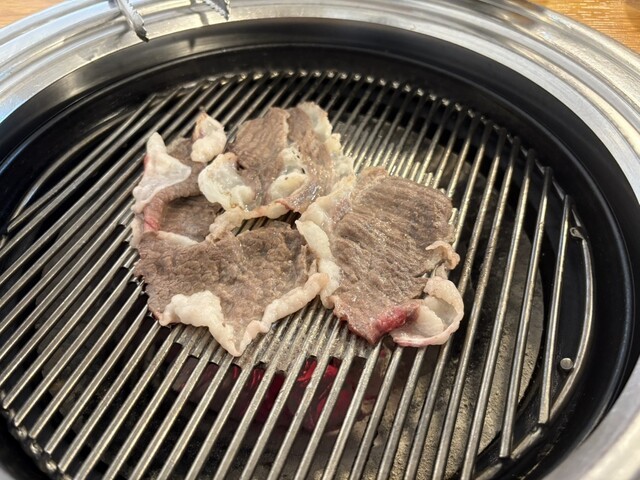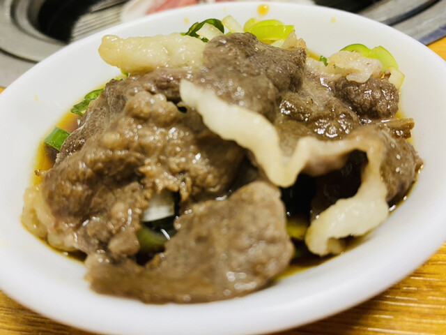 ネギがたっぷり入ったポン酢?のようなタレに、油がたっぷり乗った薄切り牛肉をつけて食べる。ホルモンも隣で焼いて挟んで食べるのも美味い。