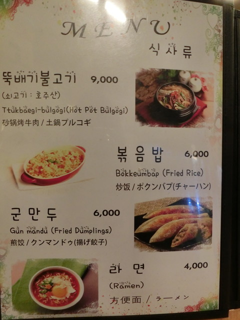 次のクラフトビアバーに行く前にご飯を食べておこう。まだ日本で食べられる辛い韓国料理は食べていないな。店前のメニューを見ていたら馴染みのあるものばかりであった。韓国料理をあまりしらない私でもすべてのメニューを食べたことがある。日本語でメニューが書いてあるので選ぶのに安心。おじさんが店から出て来て店にはいるように勧められた。中には一組のお客さんがいた。この辺りの韓国料理店はどの店もあまり混雑はしていない。若者は今ポピュラーな食べ物に夢中である。