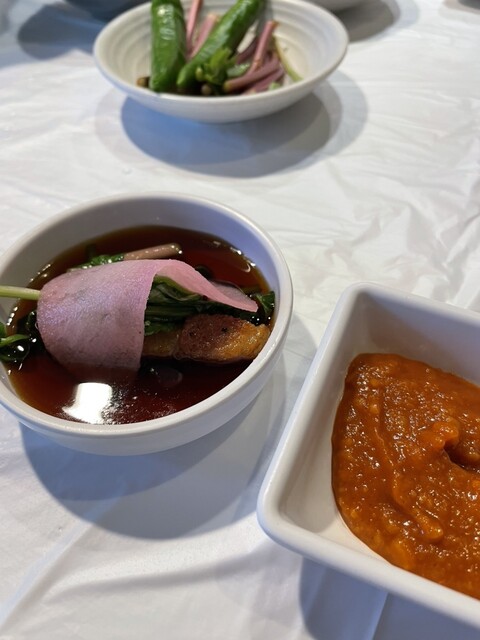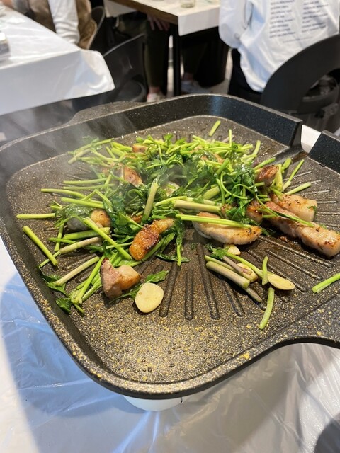 一人前はお肉150gです。店員さんが鉄板でサムギョプサルとさつまいも、そしてセリの束を焼いてくれます。セリを肉に押し付けながら焼くことで、セリの香りをお肉に移すそうです。セリと一緒に食べる分、普通のサムギョプサルのようにサンチュやエゴマの葉はありませんが、生食用のセリや酢漬けの大根や白菜玉ねぎといったお漬物系のお菜と一緒に食べるのでさっぱりといただけます。焼いてサムギョプサルの脂を吸ったセリは香りがたっていて、いくらでも食べられました。