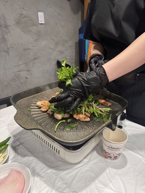 店員さんがその場で肉を焼き、焼けたらミナリの葉を肉に付けて焼いてくれます。