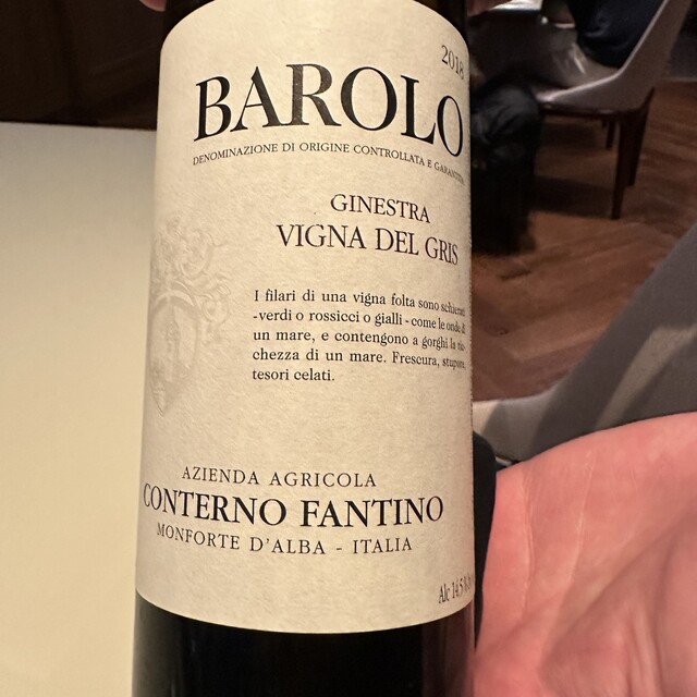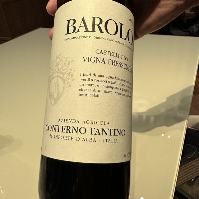 合わせるアルコールは何が良いのかソムリエに尋ねたところ、基本的に白ワイン中心でとのサジェスト。ペアリングワインも用意されているので、3グラス(白2 赤1)でトータル375mlをチョイス。因みにペアリングは他に6グラス(105mlx6)、あるいは8グラス(90mlx8)が選択できましたが流石に多すぎるという判断。赤ワインは同じ作り手、同じビンテージのバローロを2グラスのテースティング的提供となり、この粋な計らいはよかったですね。