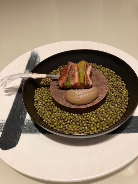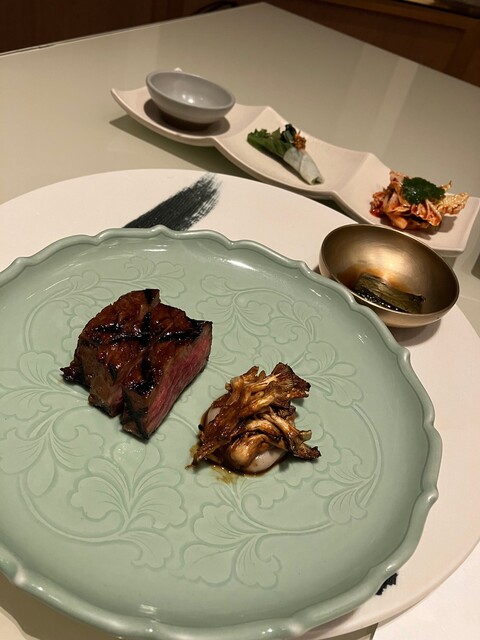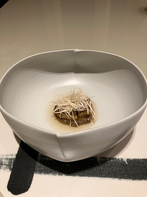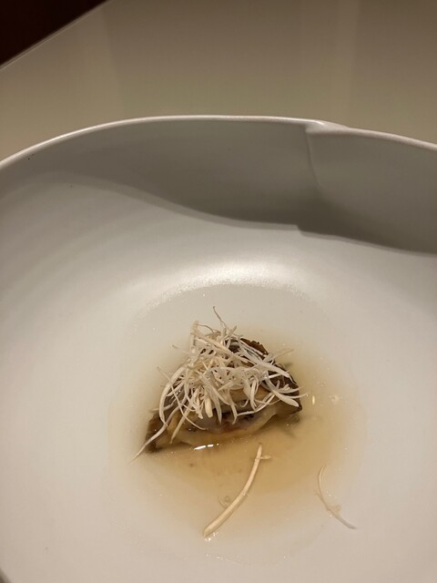 ③牛肉と貝柱、アワビとしいたけ、上にのっているのは松茸
