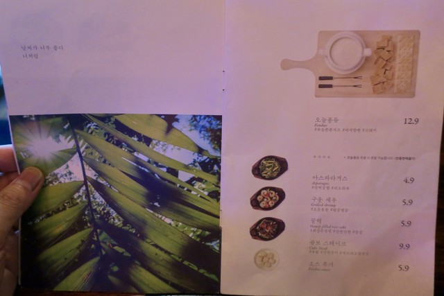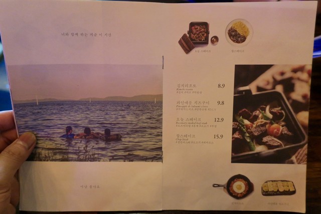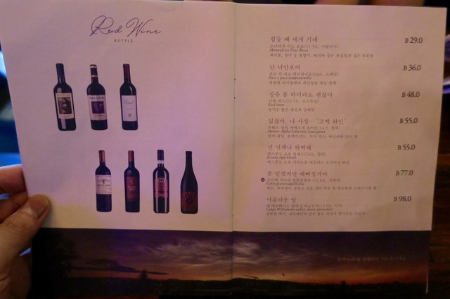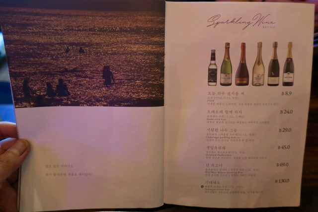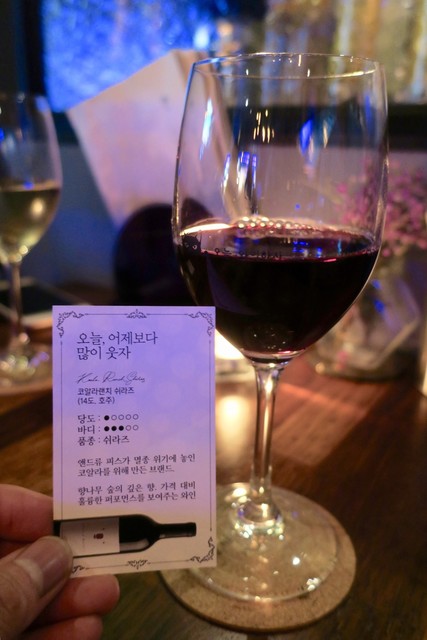 メニューには各ワインに「고생했어 "토닥토닥"」(ご苦労様"なでなで")とか、「언제나고마워」(いつもありがとう)とか「넌예쁘니까」(あなたは綺麗だから)、「오늘 하루가 선물이에요」(今日一日中が贈り物です)といったようなキラキラ系なキャッチフレーズ?みたいなものが付いている。