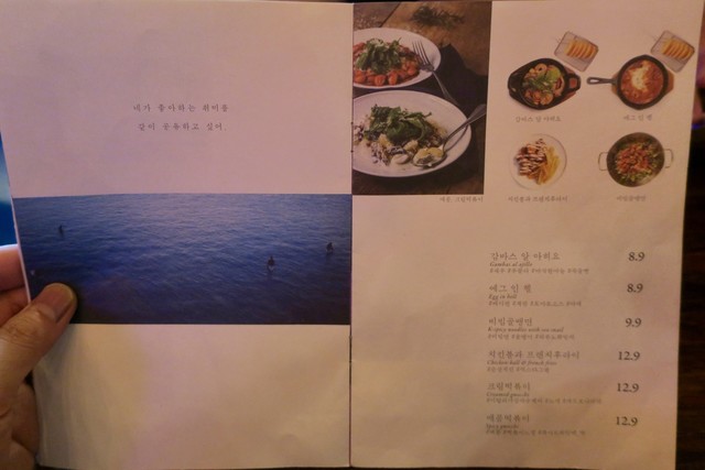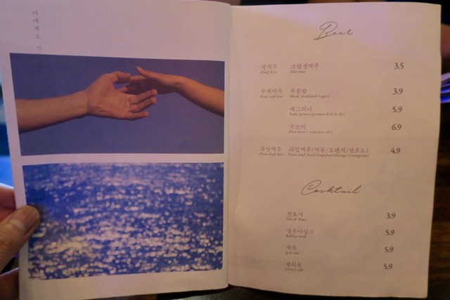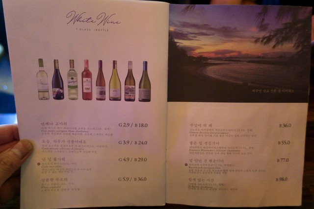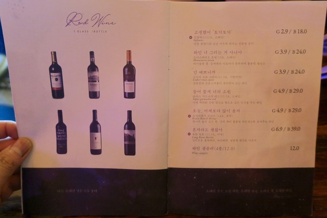 ワインは赤、白ともグラス1杯2900₩(約290円)からとリーズナブル。でも銘柄を見ると日本で飲むよりはやや割高な感じかな。韓国だとコンビニやスーパーでもボトルワインは安くても2000円弱はしていて、日本のように500円前後のデイリーワインみたいなものはほとんど見かけない。日本で1000円ぐらいで売っている銘柄が2000円ぐらいで売られている印象。