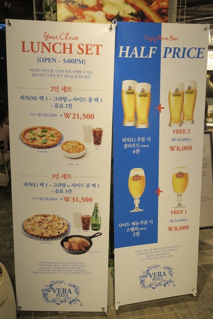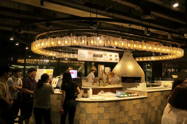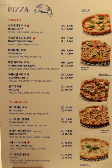 1Fにあるナポリ風ピッツェリアの「VERA PIZZA」へ。カウンターの中に本格的なピザ窯が設置されている。種類によって値段は変わるが、Mサイズが8500₩〜、Lサイズで17000₩〜。
