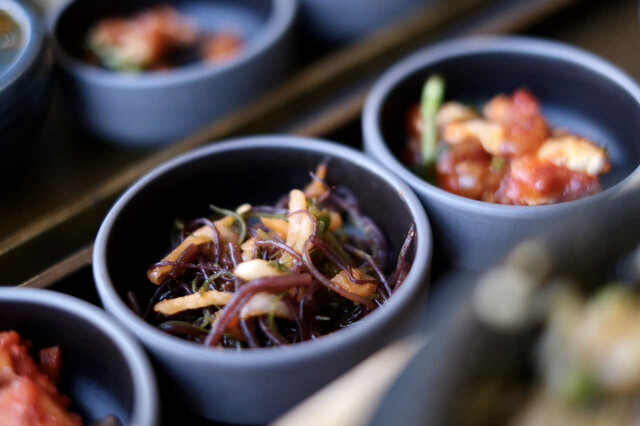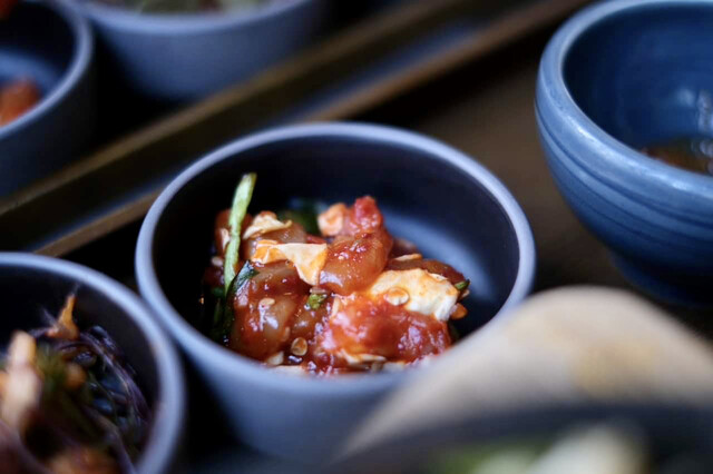 あわびの産地でもある莞島(ワンド)産のあわびを惜しげもなく盛った贅沢なビビンバ!明太子もたっぷりで至福の味わいでした。パンチャンのイカキムチも絶品でわかめスープもほっこり。カンジャンケジャンビビンバ(21000₩)もひと口いただきましたが、こちらも美味しかったです。