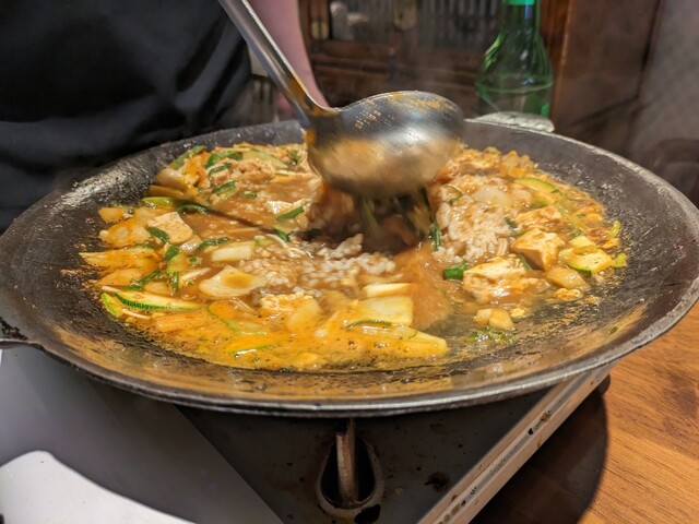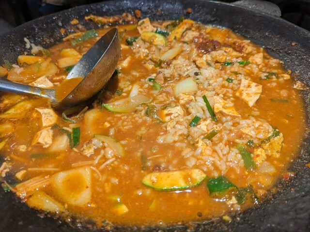 次にテンジャンスッパッ(된장숱밥)を頼んでんけど、チャドルクジョルパンをした鉄板に味噌チゲとご飯をINして食べます。