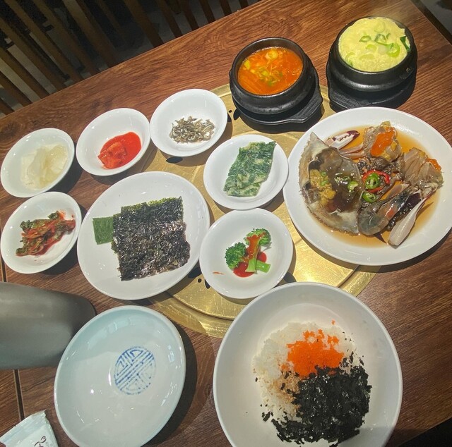 カンジャンケジャンの他にエビの醤油漬け2尾、とびっこと韓国のりのご飯、ケランチム(韓国茶碗蒸し)、チゲスープ、揚げ韓国のり、ブロッコリー、小魚、韓国のり、カクテキ、大根と柚子のお漬け物、キムチ