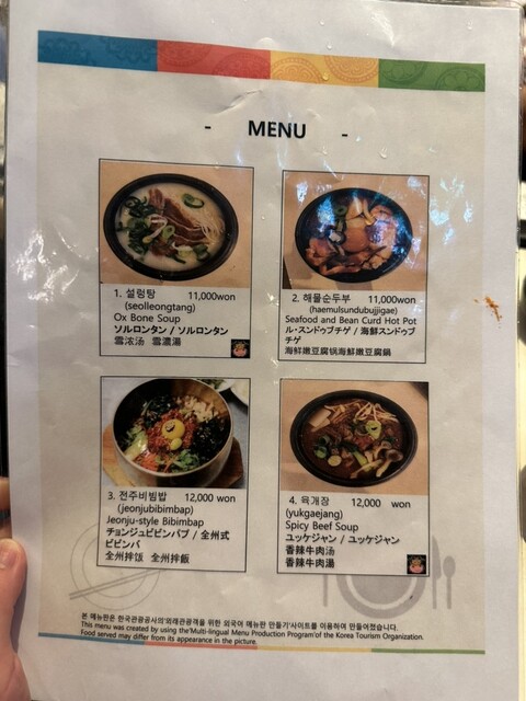ソルロンタン、ビビンバ、チゲ、ユッケジャン、プルコギの5種類のみ。