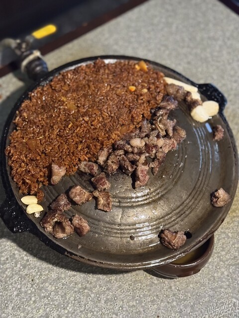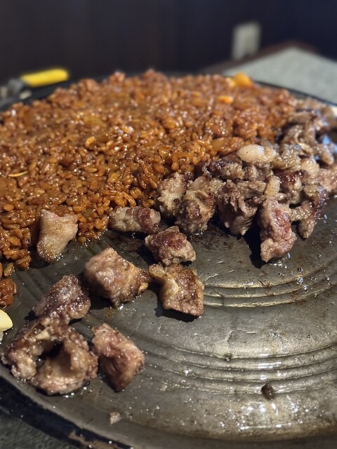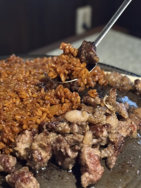 骨付きカルビの反対側、脂身の多い部分をカットしてじわじわと脂を抽出しながら、それと絡めつつ炒飯を仕立ててくれる。