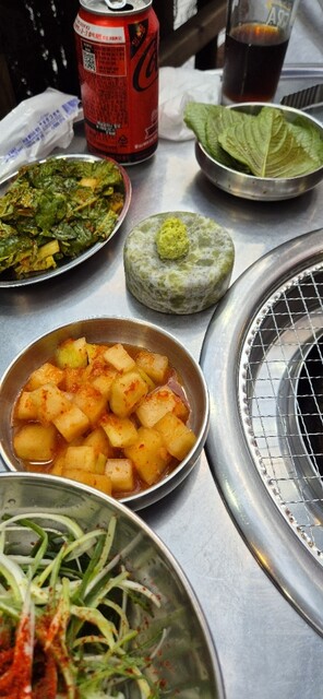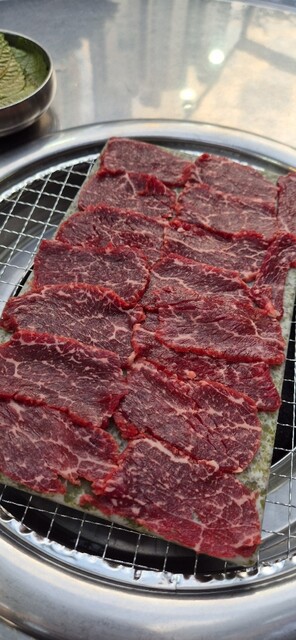 バンチャンは種類豊富で自家製っぽいけど味はまぁ普通。肝心の韓牛は脂が強めで、特に살치살はジューシーすぎて肉本来の味があまり感じられず。逆に안심 (テンダーロイン)は熟成感があり旨味がぎゅっと詰まっていて◎。牛刺身も臭みなくすっきり。