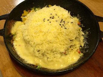 雪花チーズ鉄板ビビンバ(9,000ウォン)はチーズ盛り過ぎ! チーズが伸びるので、納豆のようになり、取り分けが難しい。味付けはマイルドで、普通に平らげた。