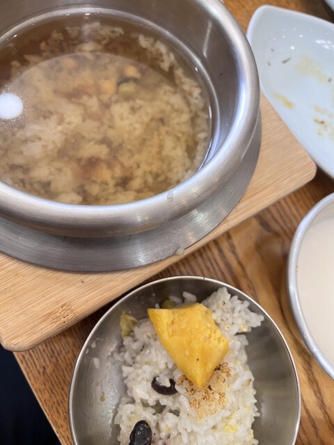 そして栗、芋、銀杏、豆、雑穀類がたくさん入ったメインの石釜ご飯が登場。これは栄養があって体に良さそうです。アジュモニが釜を置くなり手際良く石釜の中のご飯をお茶碗によそって、石釜にはお茶を注ぎヌルンジ(おこげスープ)を作るデモを見せてくれました。