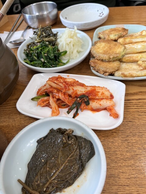 程なく定食にセットになっているチゲとバラエティ豊富な手作りのおかずがテーブル一杯に並べられました。内容は、3種類のナムル、キムチ類、イシモチの焼き魚、韓国カボチャと豆腐のジョン、エゴマ葉醤油漬け(ケンニプ)、海苔、茹でキャベツと青菜にジャコの佃煮などです。