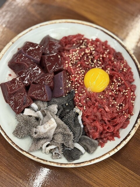 ユッケ&レバ刺し&センマイ刺しが豪快に盛り付けられた一皿を注文。