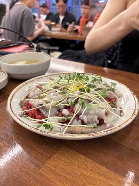 ホテルのそばにこちらがあったので、行った。センマイとレバー刺とユッケの盛り合わせとビールとライスを頼んだ。二日酔いにはごま油がハードでしたが、目的のユッケは食べられて満足。1人でも入りやすい、混んでい...