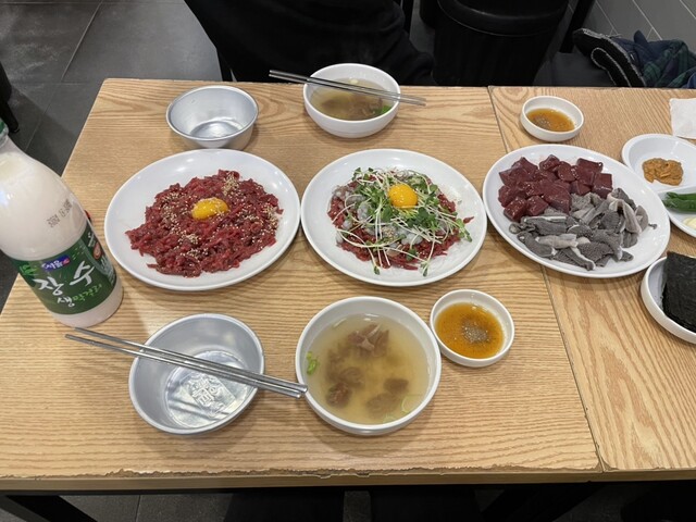 ユッケ、生レバーとセンマイ、ユッケと活きテナガダコ、マッコリ