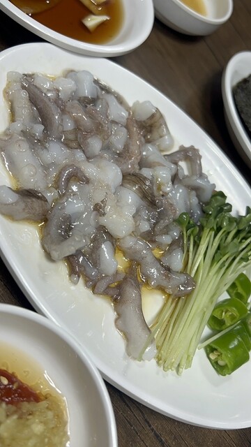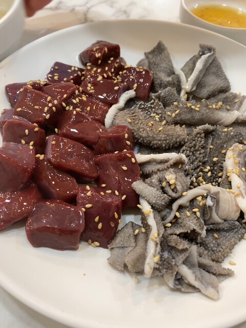 日本で食べれないレバ刺しとセンマイ刺し、ユッケサンナクチを食べました。ユッケビビンバとトッポッキも気になって注文。家族4人で食べてお腹いっぱいの量でした。