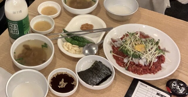 ソウル旅行、初日の夕食はこちらへ。多くの人で賑わう広蔵市場(クァンジャンシジャン)。その中でもさらに人口密度の高い通称ユッケ通り。長い行列の有名店の、その間にあるこの店。とはいえこちらも3組待ちだが、...