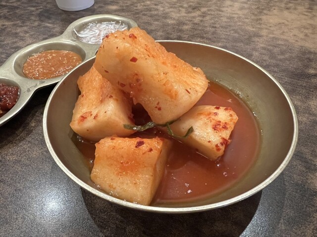基本のおかずはカクテキ、大根の和え物、生ニラ。