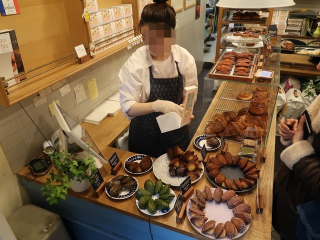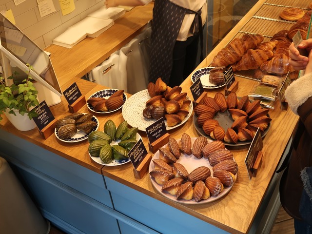 小さなお店に、マドレーヌ数種、フィナンシェ、焼き菓子数種、クロワッサン、クロワッサンにクリームサンド、あとパンがいくつか