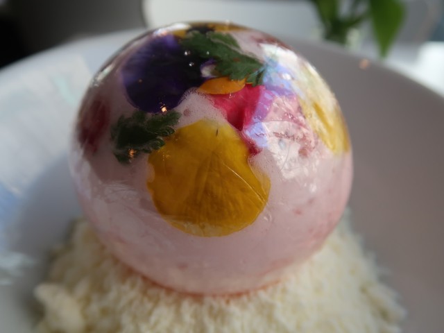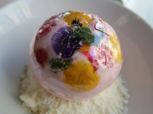 飴細工の球体の中に泡〜ムース状のピンクいのと、お花が