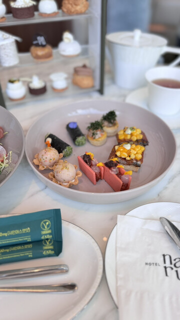 汝矣島にあるLounge & Deckで、人気コスメブランドd’Albaとのコラボアフタヌーンティーを体験しました。白トリュフをイメージしたスイーツや、ブランドカラーを取り入れた繊細なセイボリーが並び、ひとつひとつに世界観が表現されていてとても華やか。クリームやムースは軽やかで上品な味わい、セイボリーは彩りも豊かで紅茶やシャンパンともよく合いました。広々とした窓からはヨイドの街並みを眺められ、都会の中でゆったりと贅沢な時間を過ごせるのも魅力。コスメ好きの方はもちろん、特別なティータイムを探している方にもおすすめです。