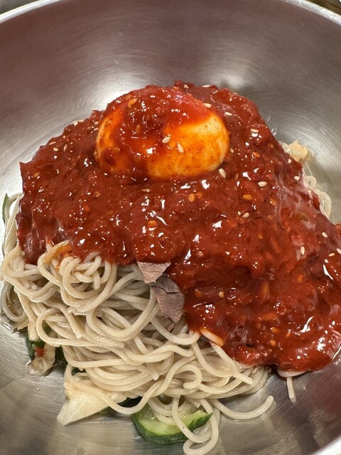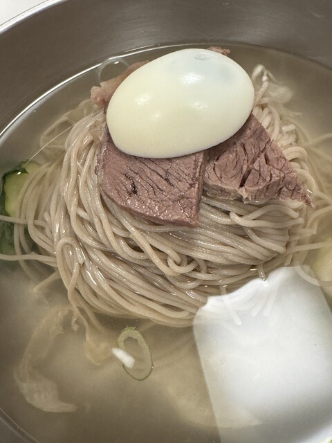 汝矣島のホテルから歩いていける距離にあったので訪ねてみました。平壌冷麺の専門店ということで1972年からやっている老舗です。メニューはシンプルで平壌冷麺の水冷麺(汁入り)と混ぜ冷麺(真っ赤なソースの汁なし)にマンドゥ(餃子)、豚バラ肉煮など10種類くらいでした、飲み物メニューが無かったのですが、冷蔵庫に見に行ってペットボトルのマッコリにしました。冷麺は細麺で柔らかめで、長いのでハサミで切って食べます。スープはややあっさりしている感じでしたが、キムチやお酢を入れてよい具合になりました。真っ赤な汁なし冷麺は見た目物凄く辛そうかと警戒しましたが、全く辛くなく食べやすくて美味しかったです。餃子はでっぷりとして食べ甲斐がありました。レストランというより食堂といった風情で、店員さんも適当に親切で値段もリーズナブルで良いお店でした。