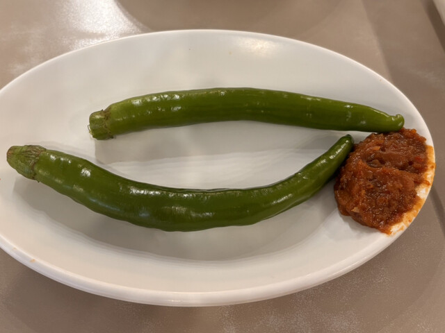 青唐辛子は全く辛くなくピーマンとししとうの中間みたいな味と食感。キムチはめちゃめちゃ辛くて少ししか食べられなかった。