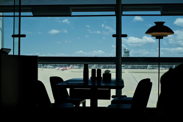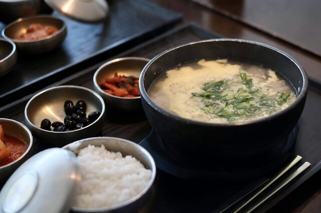 店内は広く開放的。滑走路を望む窓も大きく居心地が良いです(呼び出しボタンはテーブルの側面にあります)朝ごはんが遅かったので軽めに「북엇국(プゴグッ)」をチョイスしてみましたよ(万年酔っ払いなので)」