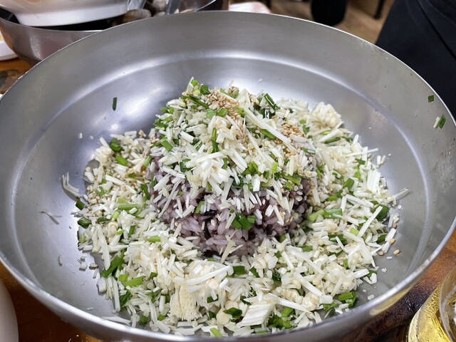 締めのチャーハンは、雑穀米?とニラなどの薬味がたっぷり乗ったお皿が届き、