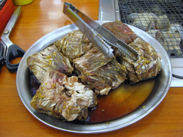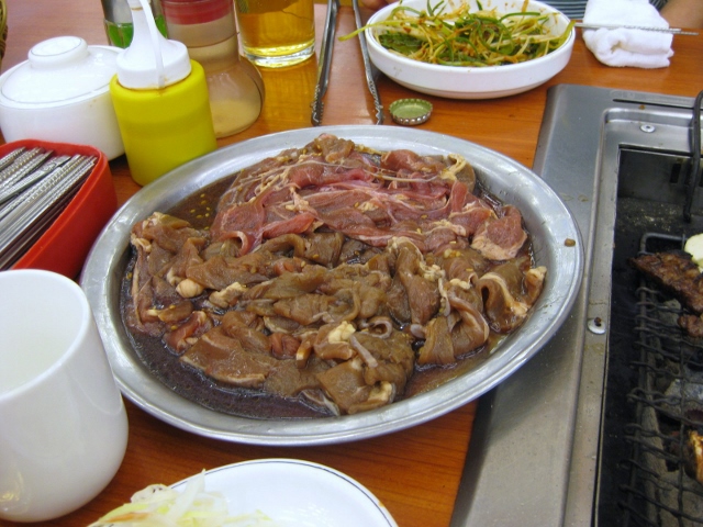 ロースを食べ終ったら焼肉8000W、お店では焼肉って訳されてるけど「プルコギ」の事でした。 甘辛いタレに充分漬けられてるから家族3人ビールが進みました。