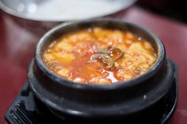 壁面メニューは日本語表記あり、日本語も普通に通じます。スンドゥブ専門店と謡っていますがとテンジャンチゲ(共に7000₩)もすこぶる美味しい。ただ私的にスンドゥブのふわふわ豆腐に軍配!キムチとトンチミスープも絶品です。