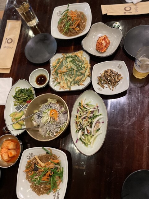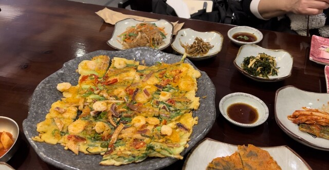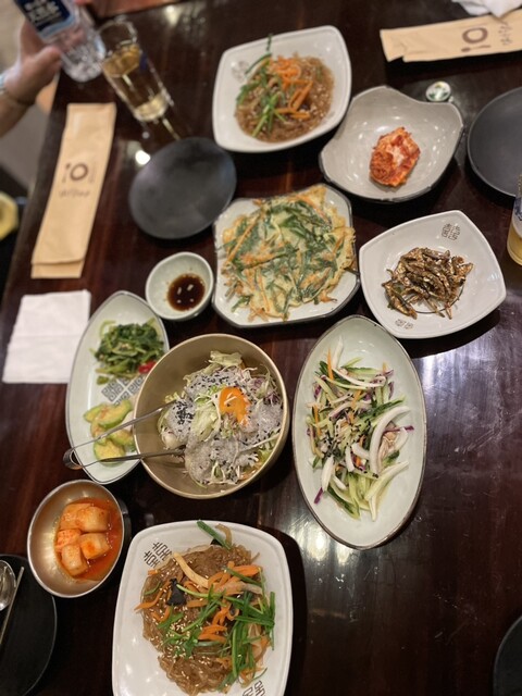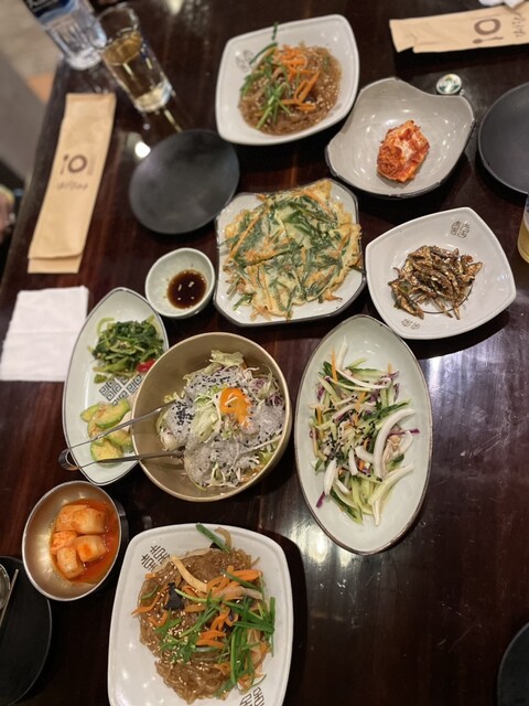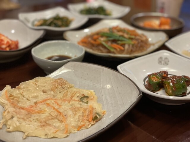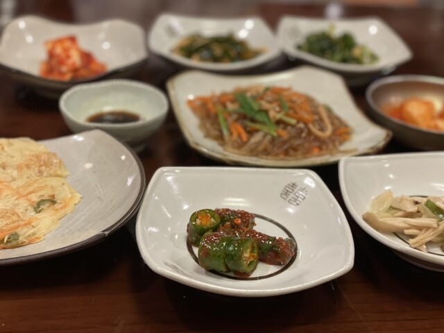 テーブルには小皿料理がずらり。キムチやナムル、チヂミにチャプチェまで揃い、これだけで...