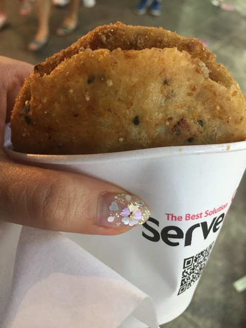 おばさん1→揚げたホットクにハサミで切り込み入れてナッツをまぶして、紙コップに入れる