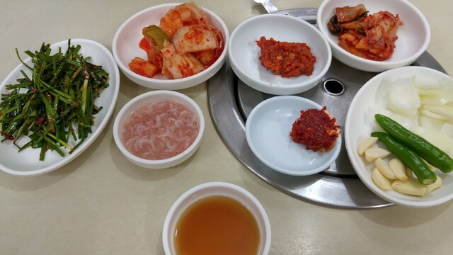 テーブルに運ばれてきたのは、たっぷりのパンチャン(おかず)と一緒に盛られた柔らかい茹で豚。