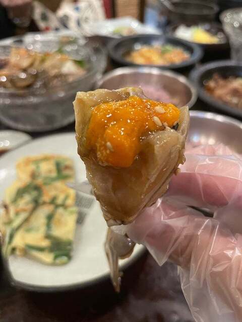 甘辛いタレに付け込まれがケジャン。手袋してチューチュー食べます。