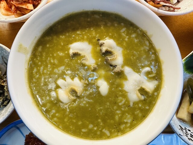 ここの鮑粥は肝入りなので緑色して香りとほろ苦さもあり美味しいです