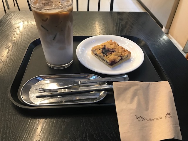 甘さ控えめのお菓子と冷たいカフェオレでリフレッシュです