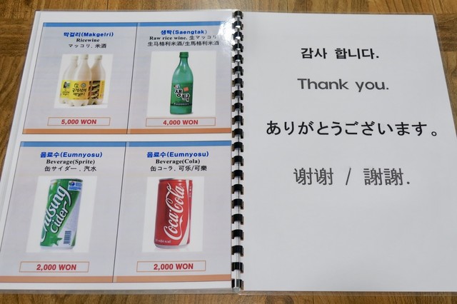スユッ用のタレが珍しくチョングッチャン(清麹醤:大豆発酵ペースト)が入っている。他でスユッを食べたときはいつも酢醤油にスライスした生タマネギが入ったタレが定番だったけど、このタイプは初めてだ。店員さんがスユッをエゴマの葉で巻いてニラキムチと一緒に食べてみて、とオススメの食べ方もジェスチャーで教えてくれた。