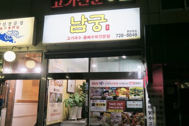釜山の中央洞(チュンアンドン)にある「남궁고기국수(ナムグンコギククス)」へ。オフィス街の裏通りの飲食店が立ち並ぶエリアにある食堂。