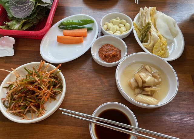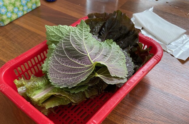 各種の付け合わせが付いているのでこれらと一緒にやエゴマの葉に包んでカルビを食べますが辛すぎず甘みもあり中々美味しいです。
