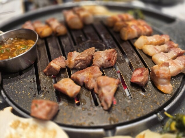 韓国、済州島南部にある韓国焼肉店「Sukseongdo Jungmun Branch」(ソクソンド・チュンムン店)。済州島で数店舗展開。天井が高く大空間で食事が楽しめる。南部リゾートホテル群から車で5...