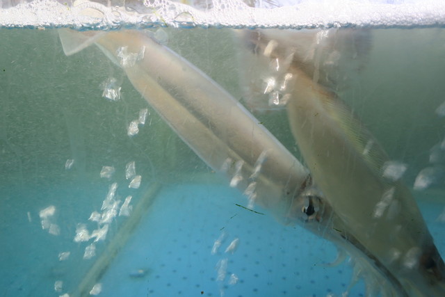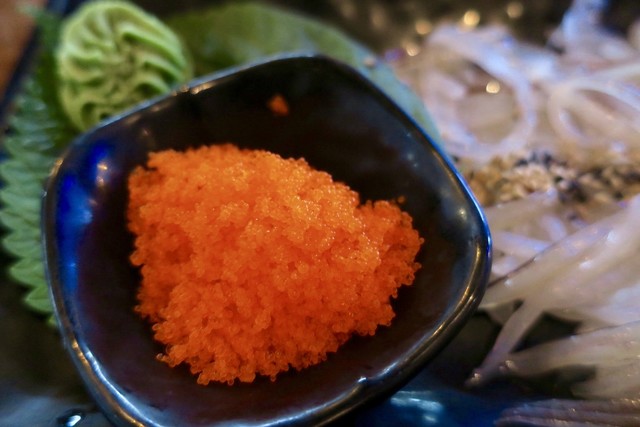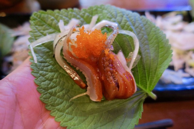 活きイカの刺身はさっきまで水槽で泳いでたので、ゲソがまだうねうねと動いてる。胴の部分はイカそうめんみたいに細切りにされていて、胡麻がふりかけてある。付け合わせはサンチュにエゴマの葉、生タマネギにカイワレ大根、トビウオの卵。肉だけじゃなくイカの刺身も野菜に包んで食べるのか。