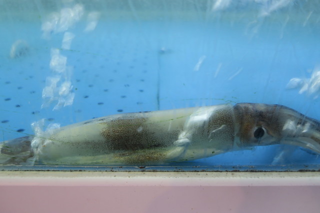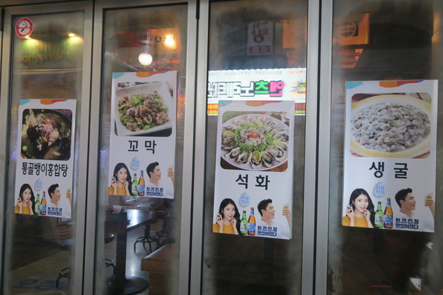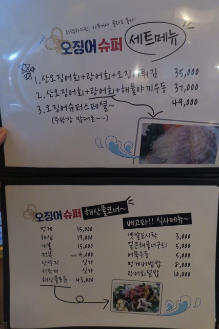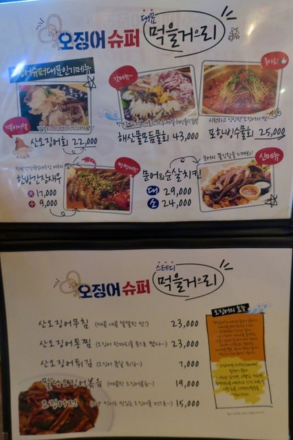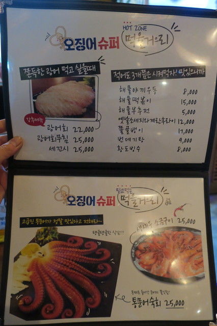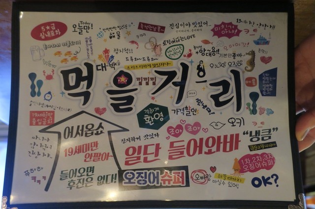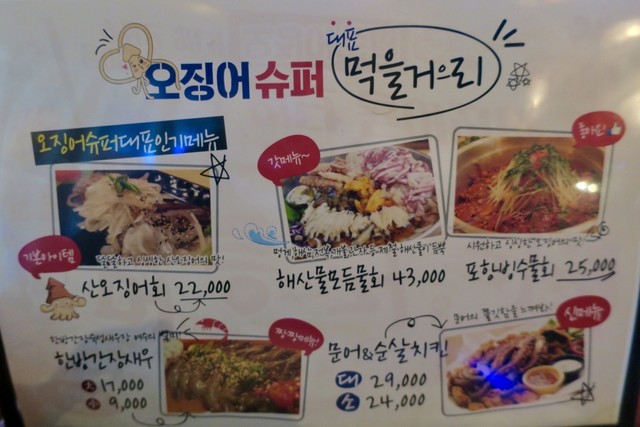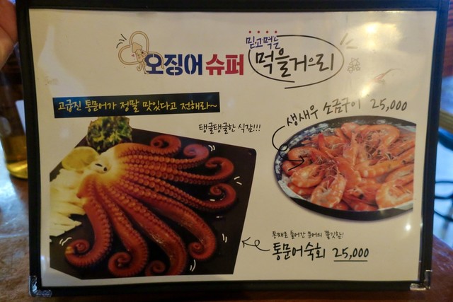 オンジオはイカ、シュポはスーパー。韓国の魚介料理屋はお店の前に水槽を置いて魚を泳がせてるお店が多いけど、スルメイカが泳いでるのは初めて見かけたので夕飯はここに決めた。