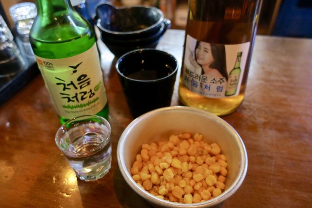 「ソジュ(焼酎)」4000ウォンとお通しの揚げトウモロコシ